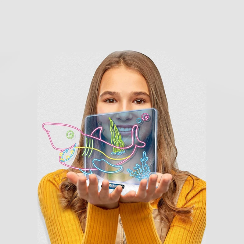 Tablette lumineuse 3D conçue pour stimuler la créativité des enfants grâce à des effets visuels LED et des lunettes 3D. Un support éducatif ludique idéal pour le dessin, l’imagination et l’apprentissage sensoriel.