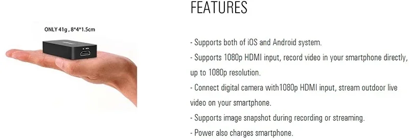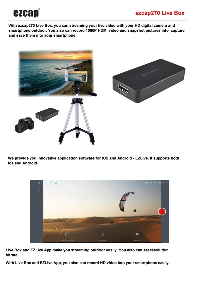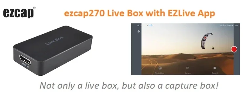 Boîtier de capture HDMI ultra-portable, idéal pour le live streaming, l’enregistrement vidéo en 1080p et la diffusion mobile depuis caméra, reflex ou console. Compatible iPhone, Android, PC, OTG & EZLive App.