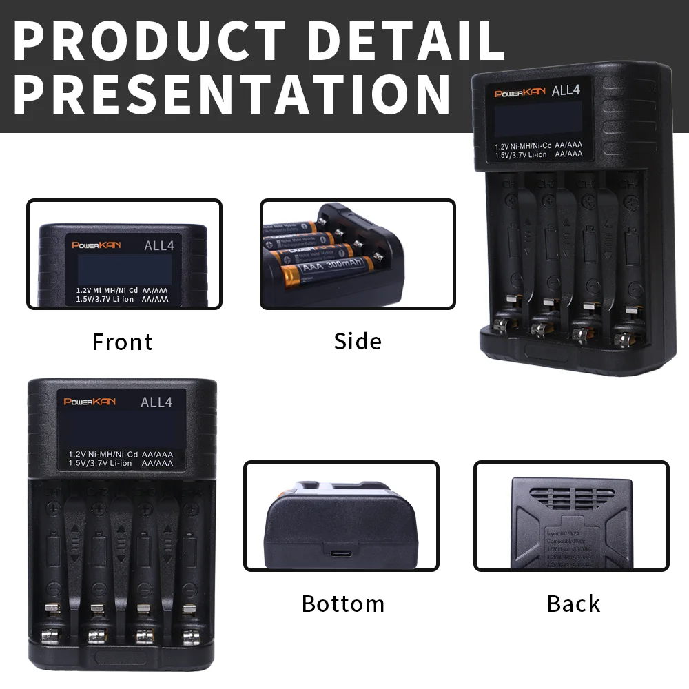 POWERKAN ALL4 AA/AAA 4-slot Small Convenient Battery Charger for 1.2V  Hi-MH& 1.5V/3.7VLi-ion With LCD Screen Socosytech