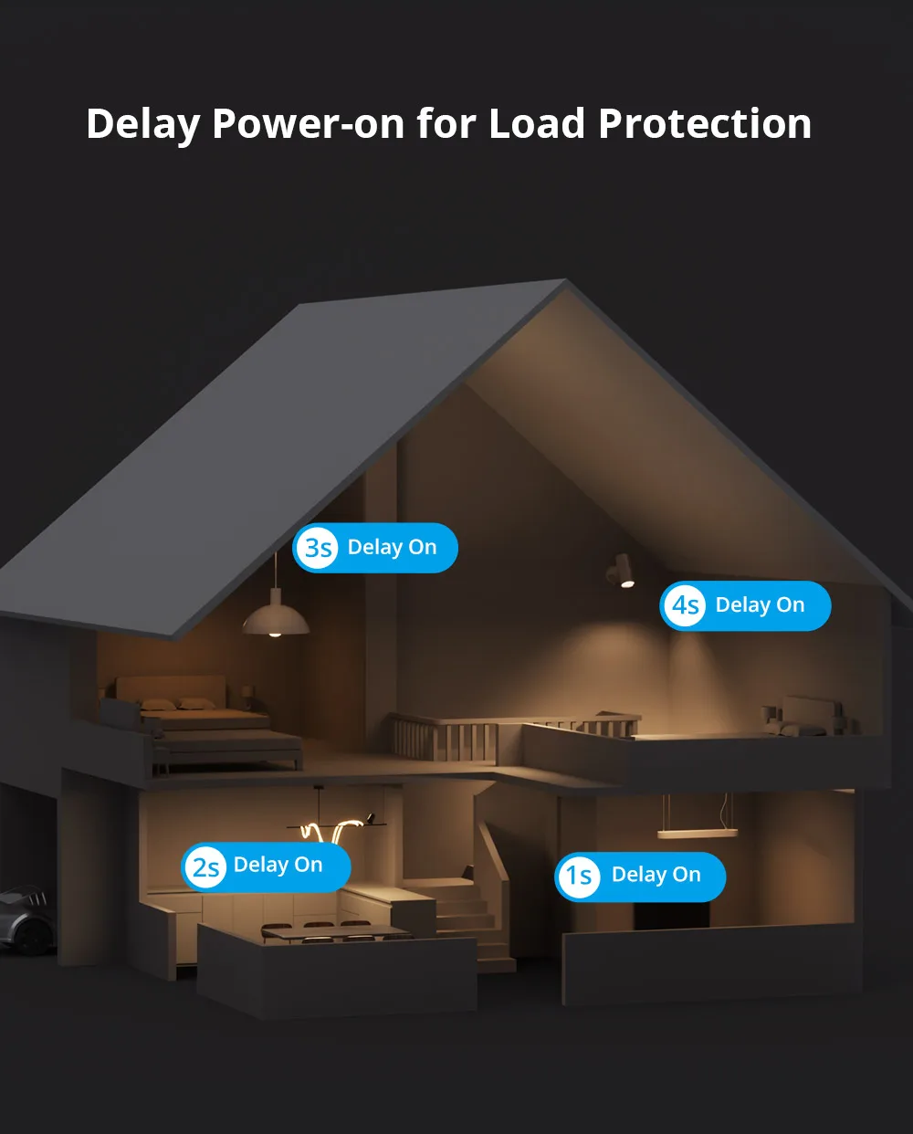 Worried about damage from sudden power restoration after an outage? Delay power-on is your solution, preventing harm from high currents when multiple loads turn on simultaneously.