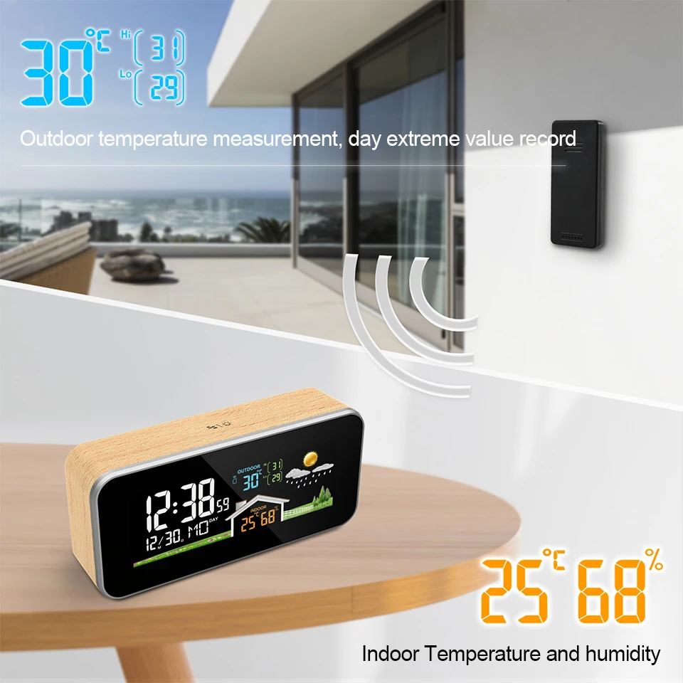 Station météo réveil TELEHILL au design bois, équipée d’un large écran LED couleur pour un suivi précis de la météo, des températures et de l’humidité. Idéale pour le salon, la chambre ou le bureau, elle combine esthétique moderne, données fiables et fonctionnalités avancées.